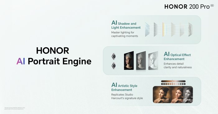 The HONOR AI Portrait Engine boasts three distinct layers— AI Light and Shadow Enhancement, AI Optical Effect Enhancement, and AI Artistic Style Enhancement—each designed to elevate the portrait photography experience.