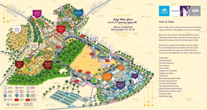 Single day and three-day Grandstand ticket holders can benefit from a ‘Park & Ride’ service, which will operate from King Saud University, with space for up to 7,000 cars.