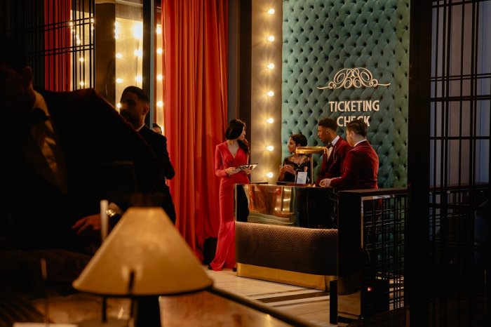 Il Baretto underwent a full revamp of the restaurant in preparation for the night, transforming it into an Italian teatro. All windows were covered for more privacy, creating an intimate party vibe, and the usually bright and modern dining room was transformed into a shiny, theatre-inspired haunt. Guests looked the part and turned out in black tie and their festive best – and entered the restaurant via a dazzling teatro-inspired frontage with vintage bulbs and signage that hid its usual identity. Once inside, the space was transformed with show lights, streamers, sumptuous orange velvet touches, movie posters and staff clad in sharply tailored suits and elegant sparkly dresses.