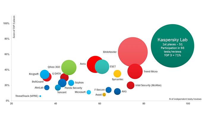 The annual Top 3 Protection rating for Kaspersky Lab follows public assessments performed by the world’s leading test labs such as AV-Test, AV-Comparatives, MRG Effitas, Dennis Technology Labs, etc. The rating is based on the number of top three places achieved by the products and the number of awards received, relative to the number of tests in which they participated.
