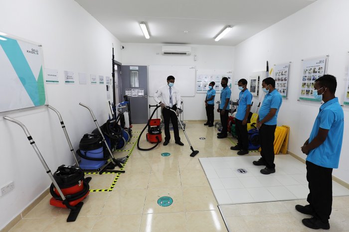 The Khidmah Training Centre is divided into zones that replicate real-life work scenarios that focus on different Hard and Soft FM disciplines including mechanical, electrical and plumbing services, cleaning, maintenance, and customer service skills among others. The Khidmah Training Centre was also during the last period training staff on the proper use of disinfection and sanitisation materials considering increased demand for such professional services.