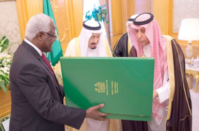 Custodian of the Two Holy Mosques King Salman receives President Ernest Bai Koroma of Sierra Leone at Al-Salam Palace in Jeddah on Sunday. During the meeting, Koroma honored King Salman with his country’s Medal of Honor in recognition of the King’s contributions in promoting world peace and defending Islam. — SPA