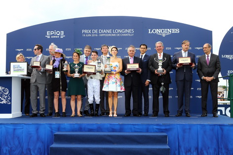 Chantilly (France) / St. Imier (Switzerland), 19 June 2016 – The filly La Cressonnière swept to victory in the Prix de Diane Longines, the world's top race for fillies, in view of an impressively large and enthusiastic audience at the Chantilly racecourse. To celebrate this fantastic performance, Christian Demuro, who rid the champion of the day, the owner and the trainer received an elegant watch from the Swiss watch maker Longines, the Title Partner, Official Timekeeper and Watch of the event for the sixth time. The raceday in Chantilly is also famous for being the rendez-vous of elegant ladies. Amongst them, Alexia Masseron won the “Mademoiselle Diane par Longines” prize. She was presented an elegant Longines timepiece from the hands of Longines Ambassador of Elegance and Asian movie star Eddie Peng.