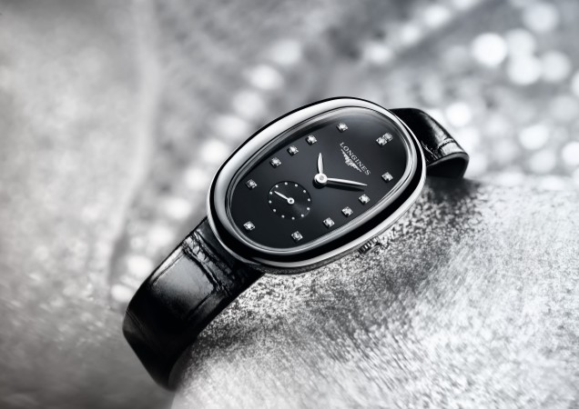 Available in four sizes – XS, S, M and L – the oval steel and diamond-set steel cases of the Longines Symphonette house a quartz movement. The mother-of-pearl hour circle comes with either diamond indexes or with inlaid Arabic numerals. The polished lacquered black dial is adorned with diamond indexes, while the silver-coloured flinqué dial features Roman numerals. Mounted on a black alligator strap or sophisticated steel mesh bracelet, these watches are water resistant to 3 bar. An exclusive rose gold version, available with or without a row of diamonds, sports a mother-of-pearl dial with diamond indexes or inlaid Roman numerals whose pink hands harmoniously match the case.