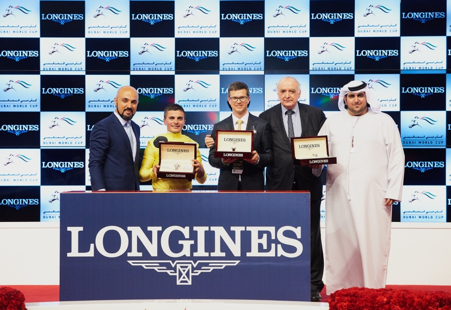 Being the Official Timekeeper of all events organized by the Meydan Group, Longines is proud to have been timing the races of the Dubai World Cup. The Swiss watch brand is also glad to be the partner of a highlight of the day, the Dubai Sheema Classic presented by Longines. Andrea Atzeni, riding Postponed, won this Group 1 race open to thoroughbreds. The owner, trainer and jockey of the winning horse were each rewarded with a Longines watch by Walter von Känel, President of Longines.