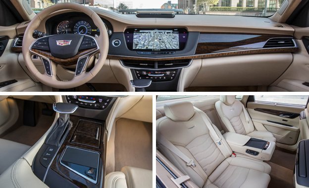 Given the CT6’s full-size dimensions and long list of standard equipment, its claimed base curb weight of 3657 pounds—within 17 pounds of a comparable CTS—is astonishingly low. (For our part, we predict curb weights between 3750 and 4300 pounds.) Cadillac further claims to have made the aluminum-intensive CT6 even stiffer than the smaller ATS and CTS—and boasts it’s the quietest Cadillac in history. As with the CTS, the base powertrain for the CT6 is a 2.0-liter turbocharged four-cylinder with 265 horsepower and rear-wheel drive. Spendier (or speedier) customers can opt for the available 335-hp 3.6-liter V-6 or the all-new 404-hp twin-turbocharged 3.0-liter V-6, both of which bring all-wheel drive. Every CT6 engine is paired with an eight-speed automatic transmission that can be controlled via shift paddles. Later on, a 4.2-liter turbocharged V-8 and a plug-in-hybrid powertrain will appear to broaden the car’s appeal.