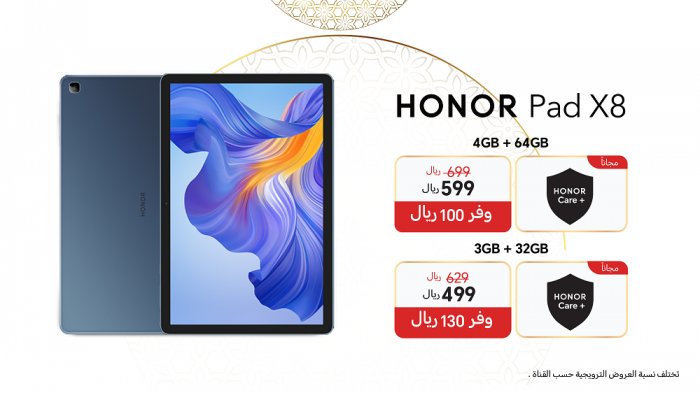HONOR Pad X8 comes with a special price of SAR 599 for (4GB+64GB) version and SAR 499 for (3GB+32GB) version. Both versions come with FREE HONOR Care+.