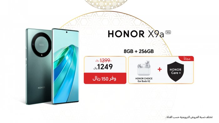 HONOR X9a (8GB+256GB) version comes at a price of SAR 1249 instead of SAR 1399 with Free HONOR CHOICE Earbuds X2 and HONOR Care+.