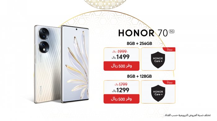 HONOR 70 5G (8GB+256GB) version comes at a price of SAR 1499 instead of SAR 1999 with Free HONOR Care+. HONOR 70 5G (8GB+128GB) version comes at a price of SAR 1299 instead of SAR 1799 with Free HONOR Care+.