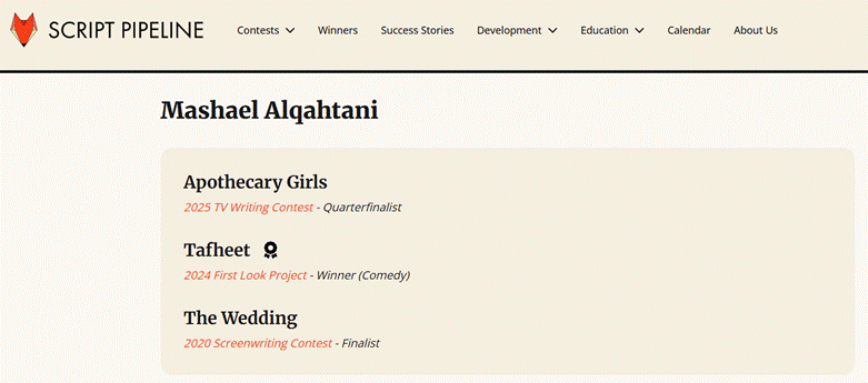 Image: Mashael Alqahtani nominations on Script Pipeline competitions | source: scriptpipeline.com