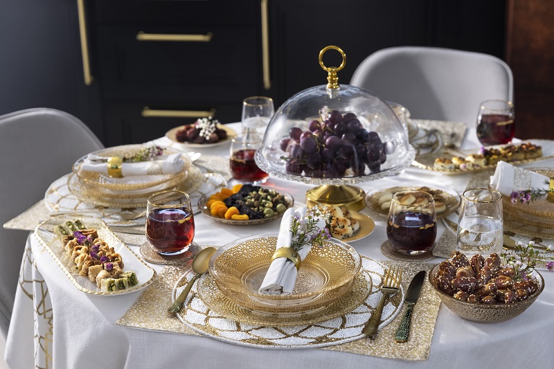 A separate, dedicated fast-breaking space, be it a tiny counter cushioned with Ramadan-themed linens or a corner of the dining table, laden with festival treats, nuts, and desserts, adds a touch of class. REDTAG brings sumptuousness to such spaces with luxury hammered-style glass cloches and ornate rectangular trays with golden calligraphic motifs. The vintage-inspired layered dessert stand or an embellished gold-calligraphic cake stand can steal the spotlight at the centre, complemented by some mellow lighting emanating from the LED strings traversing the perimeter.