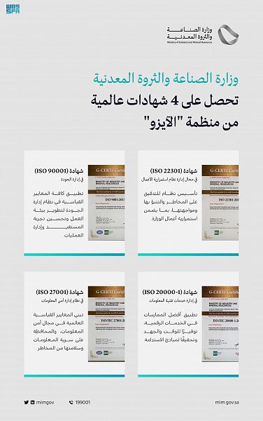 The Ministry of Industry and Mineral Resources received four international certificates from the International Organization for Standardization (ISO), for achieving international quality standards in technology, information security, quality management, and business continuity.