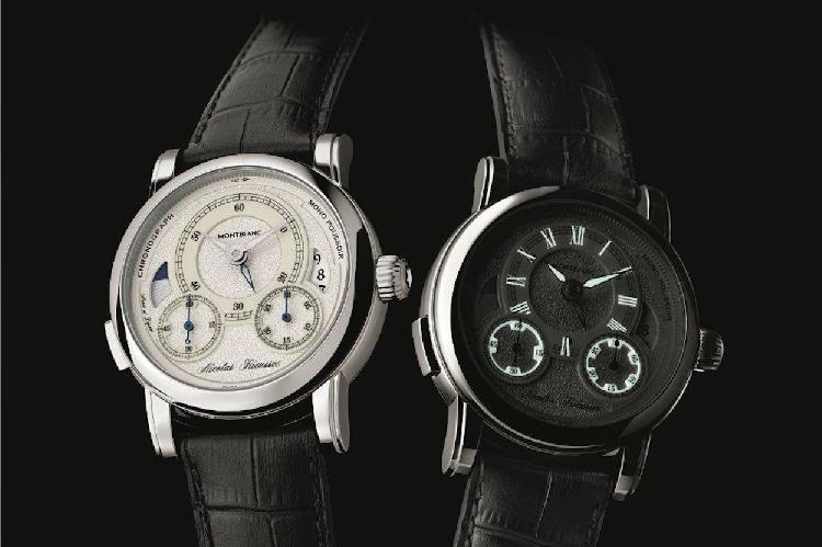 for the first time replaced by slender chronograph hands. These will not, of course, deposit a drop of ink on the counters, but will be stopped in position by pressing the push-piece situated at 8 o'clock. The corresponding lever acts on the column-wheel, which in turn transmits the order via a vertical clutch to the wheels that carry, at the ends of the pivots, the hands pointing towards a railtrack circle with numerals resembling those appearing on the dial of the original chronograph. In addition, the chronograph seconds hand situated on the left includes a counterpoise inspired by that found on the long hand of the original 1825 timepiece. In terms of the indications, for the hour ring and the graduation of the counters, Montblanc has opted, as in the case of the Homage to Nicolas Rieussec I chronograph, for an ultra-modern hybrid ceramic with the exclusive Montblanc Mysterious Super-LumiNova®, the clarity and brilliance of which is reminiscent of the enamel used in traditional dials. In daylight it displays a railtrack minute-circle similar to that found on the watches of the period, but in the dark its full potential is revealed. In fact this ceramic incorporates pigments of Super-LumiNova® to trace out Roman numerals in a typographic style identical to that employed by Nicolas Rieussec for his 1825 chronograph. This mysterious display technique contributes an added element of magic that reinforces the impact of the dial with its surface displaying a grained appearance. This is inspired by the treatment used for the metal parts of the original timepiece and highlights the apertures with a delicate satin-finished background displaying the date at 3 o'clock and a delicate guilloché pattern displaying the day/night indication at 9 o'clock. A second time-zone indication is displayed by means of a skeleton hours hand.
