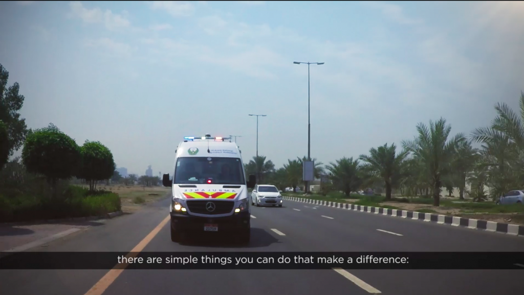 The first video focuses on the role road users can play in ensuring their behaviour does not hinder an ambulance at a motor vehicle accident. This includes: getting out of the way of an ambulance, not rubbernecking when passing an accident scene, not following an ambulance to get out of traffic and not using the hard shoulder. This film can be seen here.