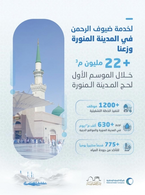 The company stated that its operational plan for this season included the development of a smart operations system to expand monitoring of water supplies in the central area and religious sites in Madinah. The plan also included the deployment of 1,203 personnel, including technical, engineering, and administrative staff, along with maintenance teams equipped with modern tools and machinery to handle all necessary tasks.