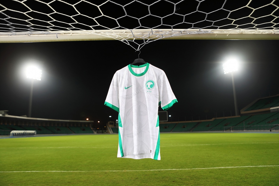 The design of the 2020-2021 kits has been inspired by the Kingdom’s cultural icons - the Arabian falcon, and the palm date tree. The new home kit features a white base coupled with a wolf grey print of the country’s cultural icons and infused with the signature green swoosh. The kit is paired with green shorts and white socks.