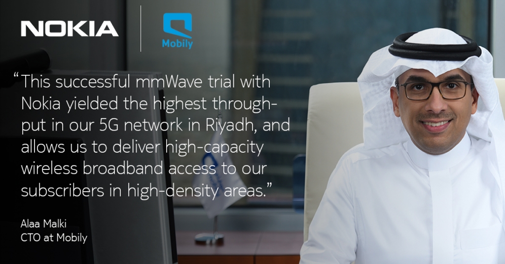 Tareq Khalaf, customer Team Head of Mobily, at Nokia, said: “Extreme network capacity and speed are essential to enable new 5G services in densified locations. We are proud to have collaborated with Mobily on the evolution of its 5G network through this mmWave trial, achieving the highest speed for them to enable innovative 5G services in busy locations for people and businesses.”