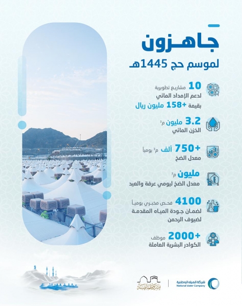 "We have worked from early on to develop plans and strategies and learn from previous lessons to improve the level of services provided to pilgrims and focus on providing the necessary quantities of water that will be distributed and pumped to Makkah and the holy rites during the Hajj season. The operational and strategic storage volumes exceeded 3.2 million cubic meters, with an average daily pumping volume of more than 750,000 cubic meters to Makkah and the holy sites, and an average pumping volume of more than one million cubic meters per day on the day of Arafa and the days of Eid Al-Adha. Qualified national cadres with more than 2000 employees will implement the plan," the company said.