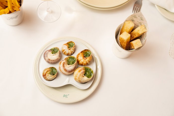 Full of charm, the interior design transports guests to the alluring vintage bistros of France. Marble floors, gorgeous chairs, and velvet green banquettes add to the restaurant’s whimsical character, while the mirrored columns complete the overall extravagance.
