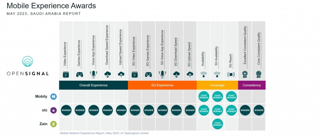 Mobily, stc and Zain jointly won the 5G Availability award with statistically tied scores of 22.7-23.9%.
