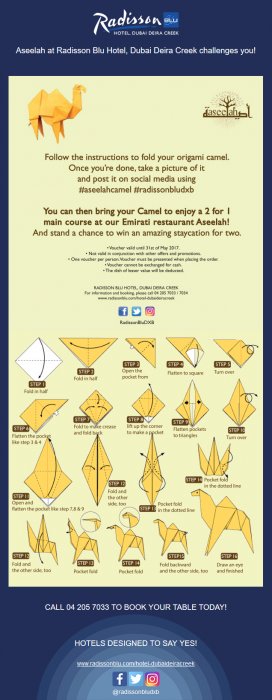 An Aseelah camel can be made out of Origami! Guests are challenged to do so with kits provided by the outlet. For Every successful origami camel a 2 for 1 main course can be claimed. In addition to the instant prize, a social media post with the best camel, hash tagged with #Aseelah and #AseelahCamel can win them an exciting stay at international Radisson Blu properties.