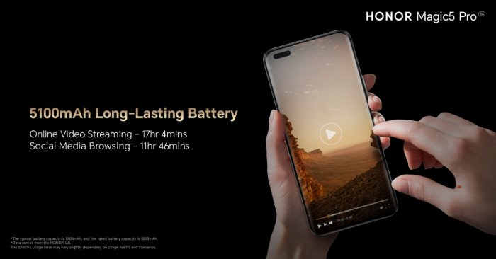 Another aspect of HONOR Magic5 Pro strength is its powerful performance. When it comes to battery life, HONOR Magic5 Pro boasts a remarkably durable 5100mAh battery that enables you to remain active and efficient without being burdened by constant low-battery notifications. Moreover, with its convenient 66W Wired and 50W Wireless HONOR SuperCharge feature, recharging your phone becomes incredibly hassle-free.