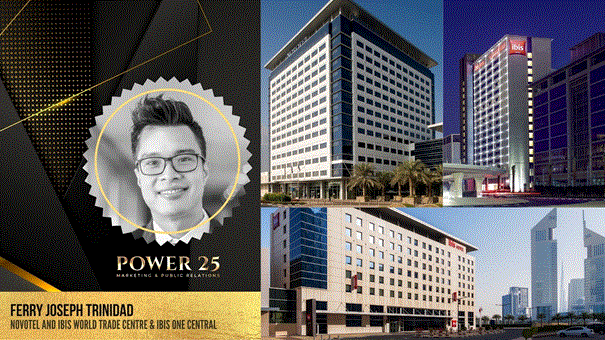Ferry Joseph T. Trinidad has been awarded as one of the Power 25 Marketing and PR Leaders among nominees from South East Asia, Middle East and Africa. This recognition was presented in an online event last Sept. 28, 2021 by the Hoteliers Web as a way of honoring the crème de la crème of the hospitality industry. Out of 100 nominees, he ranked Top 11. He is one of Dubai’s hoteliers recognized in the country for their exemplary achievements, marketing campaigns and special initiatives during the pandemic.