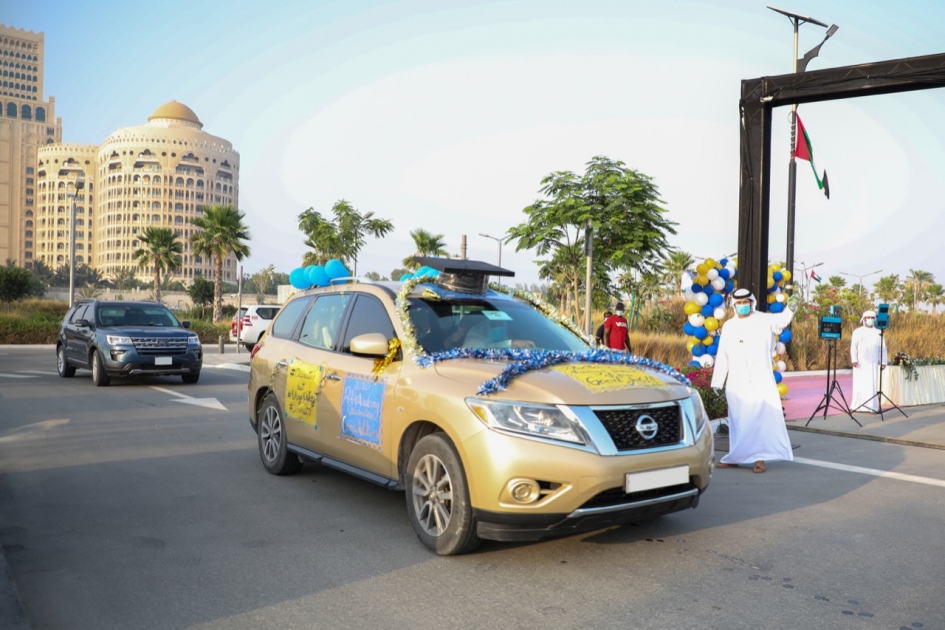 His Highness Sheikh Saud bin Saqr Al Qasimi, UAE Supreme Council Member and Ruler of Ras Al Khaimah, delivered a graduation speech to RAK Academy’s Graduation Class 2020, who were watching in cars with their parents in the first event of its kind in the Emirate, which was attended by Sheikha Amneh bint Saud Al Qasimi, Chairman of RAK Academy and Chairman of Ras Al Khaimah’s Investment and Development Office.