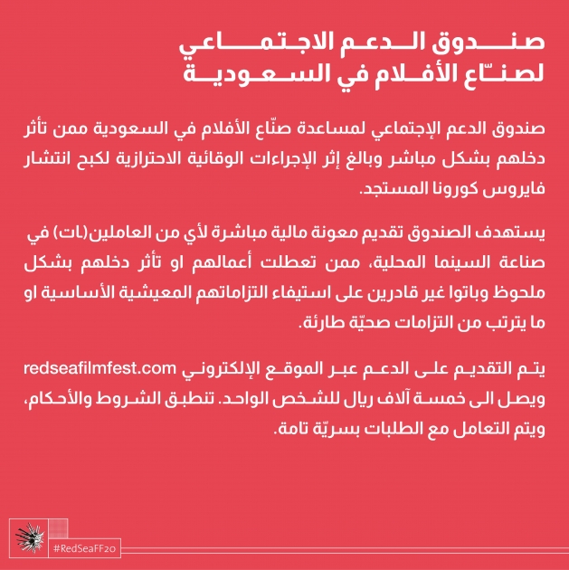The fund aims to help freelance Saudi filmmakers who have sustained a financial loss resulting from cancelled/postponed gigs or opportunity directly related to the Coronavirus COVID-19 precautionary measures. All Saudis working in the film industry are eligible to the one-time emergency grant of up to SAR5,000 on merit basis. Applications will be open until the fund is exhausted. People who meet the criteria should apply here: https://www.redseafilmfest.com/community-fund