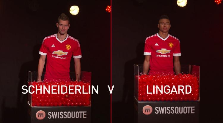The two players had to battle against the clock and decide how best to release five golden balls from a box of red balls in the quickest possible way and it was United academy graduate Lingard who emerged victorious as he successfully completed his challenge in the allotted time, while Schneiderlin was left frustrated as he elusively searched for one remaining golden ball.