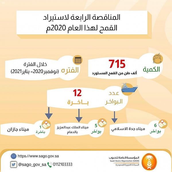 Saudi Grains Organization (SAGO) announced today that it has issued the fourth tender for the year of 2020 to import 715,000 tons of wheat to be supplied during the period of November 2020 -January 2021.
