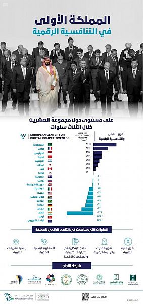 Saudi Arabia ranked first among the G20 member states in digital competitiveness in the last three years, according to the World Competitiveness Report released by the European Center for Digital Competitiveness.