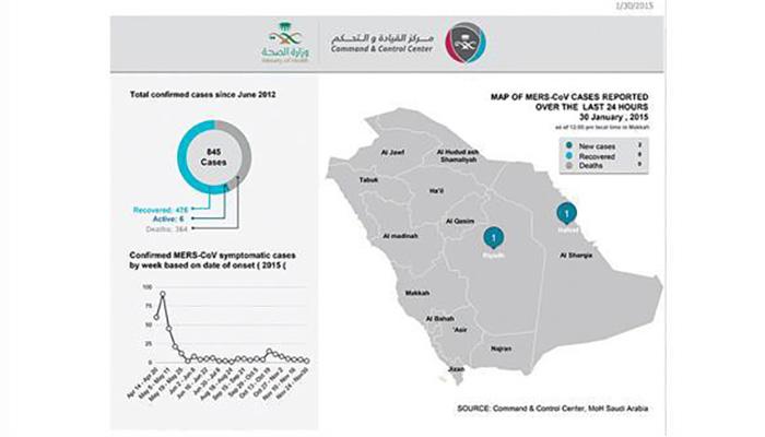 Two new cases of the deadly Middle East Respiratory Syndrome Coronavirus ((MERS-CoV) were recorded by the Ministry of Health late Friday. The Command and Control Center (CCC) at the ministry reported that an expatriate worker in Riyadh and a Saudi national in Hofuf had contracted the infection, bringing the total number of confirmed MERS cases in the Kingdom to 845 since the disease was first detected in June 2012. The CCC is the disease monitoring body of the MoH which was recently moved from Jeddah to Riyadh in order to achieve the objectives of combating infections like the coronavirus and Ebola.