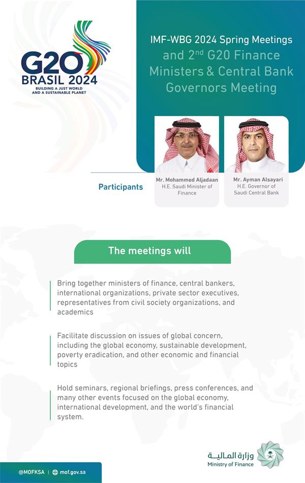 His Excellency the Saudi Minister of Finance, Mr. Mohammed Aljadaan, will head the Kingdom's delegation at the International Monetary Fund and World Bank Group 2024 Spring Meetings, to be held April 15-20, 2024 in Washington, D.C., United States.