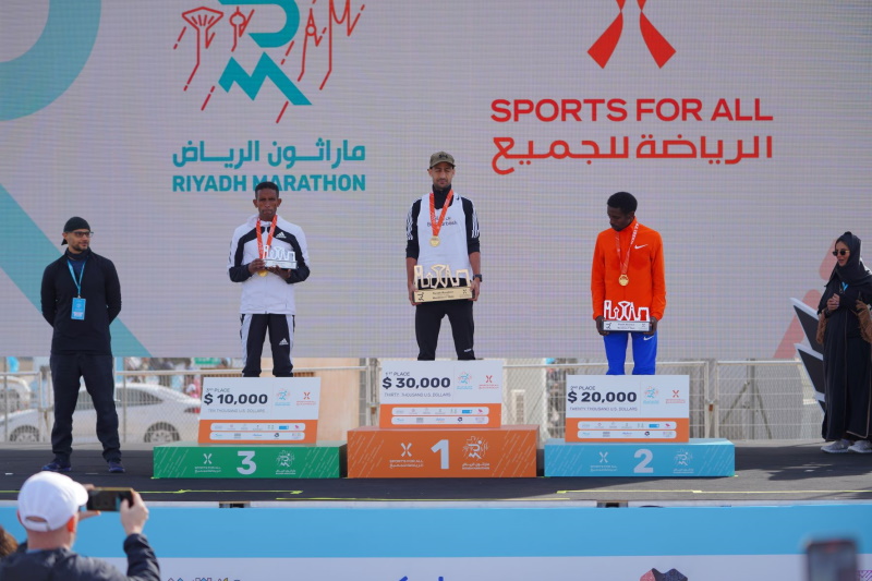 HRH Prince Khaled bin Alwaleed bin Talal Al Saud, President of the Saudi Sports for All Federation, awarded the winners of the 2023 Riyadh Marathon, in the presence of Prince Nawaf bin Mohammed bin Abdullah Vice President of the International Athletics Federation (IAAF), alongside Ms. Shaima Saleh Al-Husseini, SFA Managing Director.