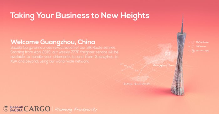 Saudi Airlines Cargo Company resumed its freighter flights to Guangzhou in China & Mumbai in India with a weekly freighter flight effective first of April 2019, aiming to meet the growing demand for cargo operations & stimulate trade movement to/from the Asian continent, in addition to the already operating 5 weekly flights to Dhaka & the 7 weekly flights to Hong Kong.