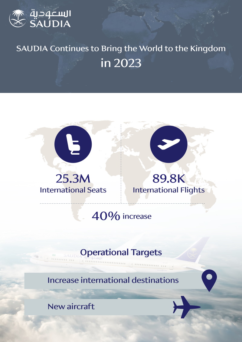 SAUDIA Group, the national flag carrier of Saudi Arabia, is continuing to implement its operational plan for 2023 by boosting its international presence and market share by increase its seating capacity by 40% on high-demand destinations. The ambitious plan aims to expand SAUDIA’s network, connect international visitors with the Kingdom, and strengthen Saudi’s tourism, Hajj, and Umrah sectors. The plan also includes an increase in domestic flights and seating capacity.
