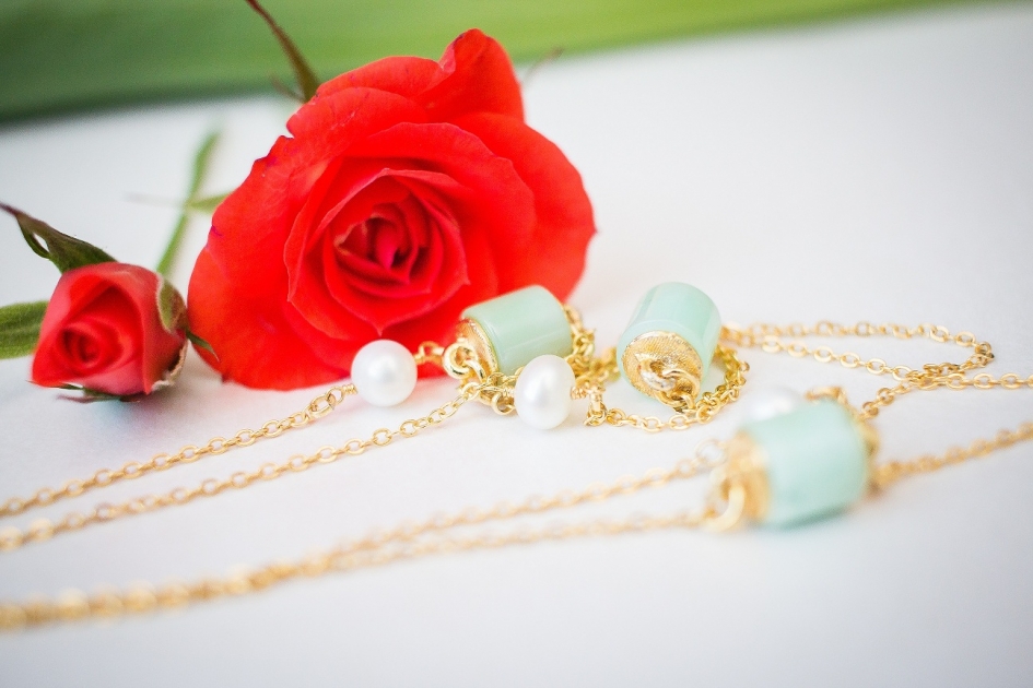 2. Beautiful chain creating a contrast with pearl and chrysoprase. 24 K gold vermeil with mother of pearl. Price: AED 398