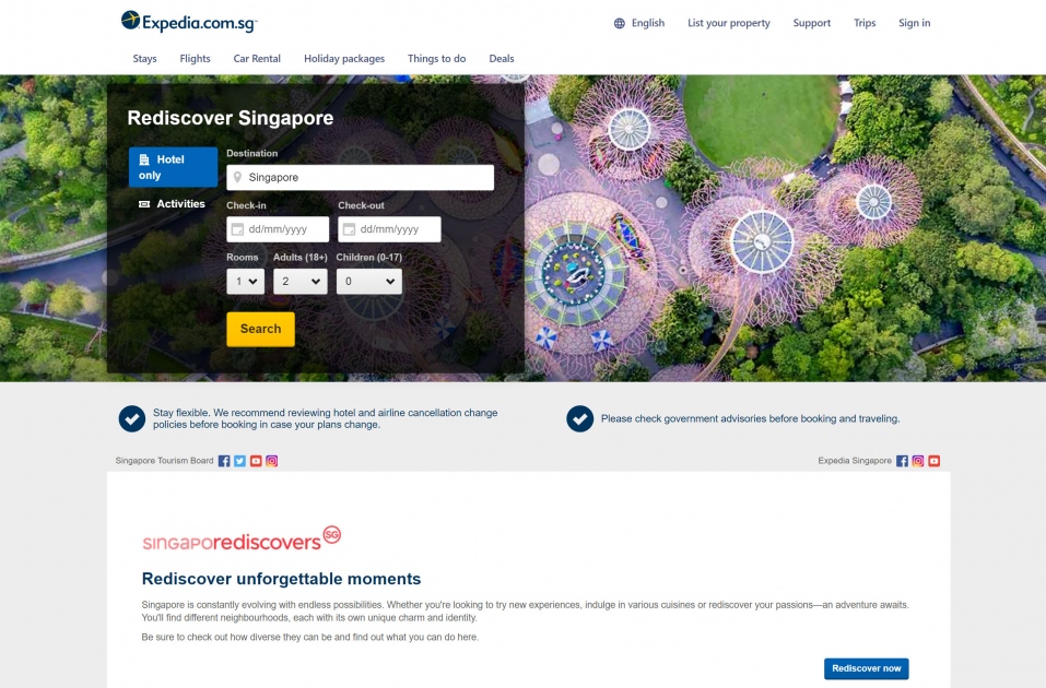 As international travel gradually resumes, STB and Expedia, through its Expedia Group Media Solutions brand, will jointly promote Singapore as the destination of choice in 10 overseas markets – Japan, South Korea, Hong Kong, United Arab Emirates, Germany, France, Switzerland, Canada, United Kingdom and United States. Apart from offering attractive promotions for travel-related products and experiences such as flight promotions, online display ads and creative campaigns will also be rolled out to put Singapore at the top of international travellers’ minds.