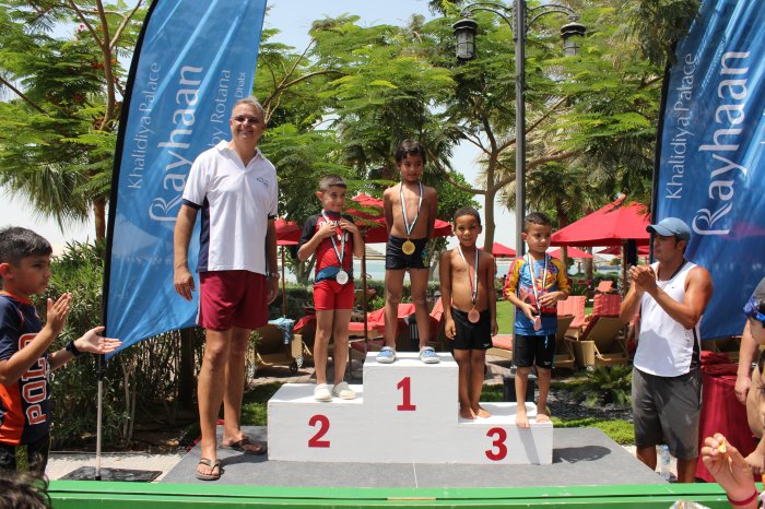 It was an exciting day for all parents and children on the 15th of May 2015 as Khalidiya Palace Rayhaan by Rotana was pleased to host its spring swimming competition by the sea waters of the Arabian Gulf. Children aged between 5 and 13 had the chance to compete and showcase their swimming strokes and skills that they perfectly tailored over months of hard practice through the guidance of motivational instructors. The competition featured three strokes – freestyle, breaststroke and butterfly. Kids swam 30 or 60 metres in each race, or the additional 120m butterfly and 300m freestyle. “I’m always trying to raise the self-esteem and confidence for the kids and put them in the pressure of competition,” Anas Karkutli said, the swimming coach at Khalidiya Palace Rayhaan by Rotana. This swimming competition welcomed approximately 80 kids in the competition who were eager to compete between each other to win gold, silver and bronze medals. They went through several months of training with the head swimming coach, Anas Karkutli, who was very proud of their super performance during the exciting day. “Our aim is to create strong competitive teams that love this beautiful sport just as much as we do. We try to ensure high quality professional training that focuses on technique instruction for all ages and abilities” said Mr. Mark, General Manager at Khalidiya Palace Rayhaan by Rotana. “Our main goal is to provide every participant an opportunity to improve their swimming technique and of course to make this day fun-filled and exciting. We were very happy to invite all parents and kids in order to spend quality time together where learning is also guaranteed.”