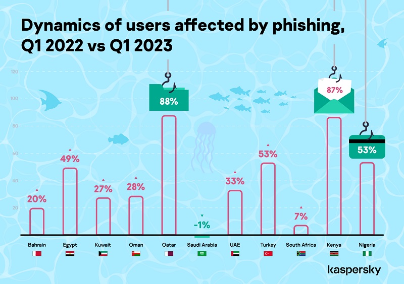 Diving deeper into social engineering cyberattacks, Kaspersky shared insights on phishing attacks which are most common in the META region. Comparing Q1 2022 to Q1 of 2023, Egypt (49%), UAE (33%), Qatar (88%), Oman (28%), Kuwait (27%) and Bahrain (20%) saw an increase in phishing attacks on users. On the other hand, phishing attacks in Saudi Arabia saw a slight decrease of 1% in Q1 of 2023 as compared to the same time period in 2022.