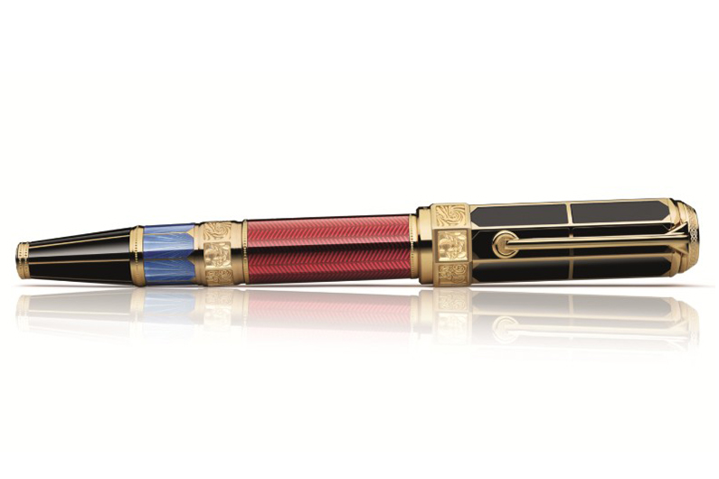Limited to 1597 pieces in reference to the year his most important play ‘The Tragedy Of Romeo and Juliet’ was first published, the William Shakespeare Limited Edition 1597 is inspired by his greatest tragedies. The multi-coloured barrel is embellished with exquisite guilloche patterns evoking his quill overlaid with precious lacquer, contrasting with the cap crafted from pure black lacquer. The black and red colours are a reference to the flags that flew above his theatre to inform audiences of that genre being performed at the time: red for historical drama and black for tragedy. As well as featuring the embossed symbols on the cap and cone’s gold-plated rings representing his most famous plays, the William Shakespeare Limited Edition 1597 is decorated with Tudor design elements reminiscent of the era in which Shakespeare wrote most of his plays and the longstanding patronage of Queen Elizabeth I. The forepart of the fountain pen is engraved with his signature, and the black resin cone features a Tudor rose at its base, the badge favoured by the Virgin Queen. The blue lacquer above the cone of the fountain pen refers to the colour defined as ‘Royal Blue’ because it was worn by royalty, the nobility and members of the Council. The colour also symbolized heavenly grace within the church, power, importance and wealth. The octagonal cap mirrors the distinctive structure of the Globe Theatre on the banks of the Thames in London with gold-coated strips set against the precious lacquer evoking the balconies that surrounded the stage and gave audiences an unparalleled experience inside the theatre.