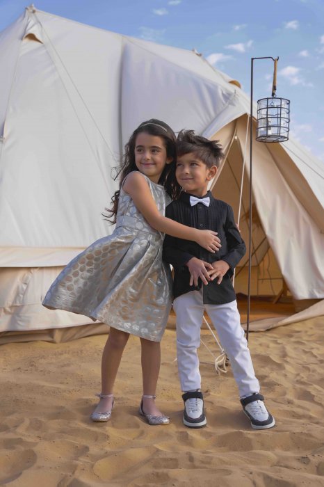 Boys can sport navy blue shirts and suspender pants to pull off a classic look or opt for outfits in shades of white and beige to display poise. For girls, there are must-have outfits for the wardrobe and staple dresses for the season: Sizzling striped gowns, rainbow denim jackets and stylish jeans, sleeveless dresses with silver polka for traditional settings, and more.