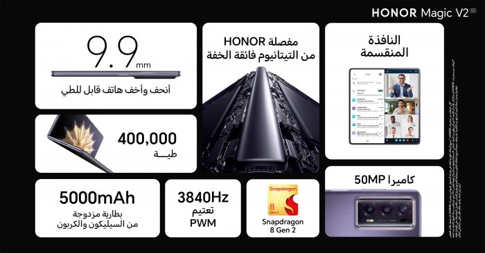 The HONOR Magic V2 will be available in a range of elegant colors: Black, Purple, and a special version in Black with a vegan leather back. Starting from 1st of February 2024, the HONOR Magic V2 will be available for pre-order in UAE at an exciting offer and free gifts.
