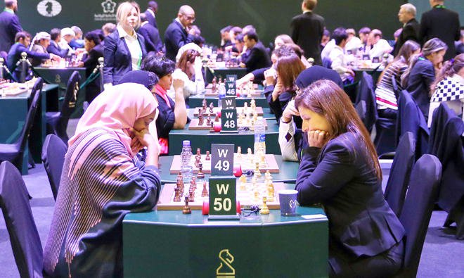 Female chess players are not required to wear abayas, but have opted to wear black or navy suits.