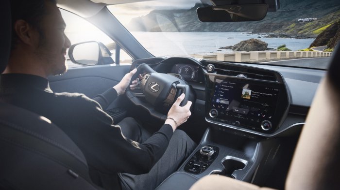 The platform and battery electric drivetrain also open up new freedoms in design. The exterior reinterprets the signature Lexus spindle shape in the vehicle’s body, while the interior is a light and open space that is both simple and luxurious, expressing Lexus Omotenashi hospitality and Takumi craftsmanship.